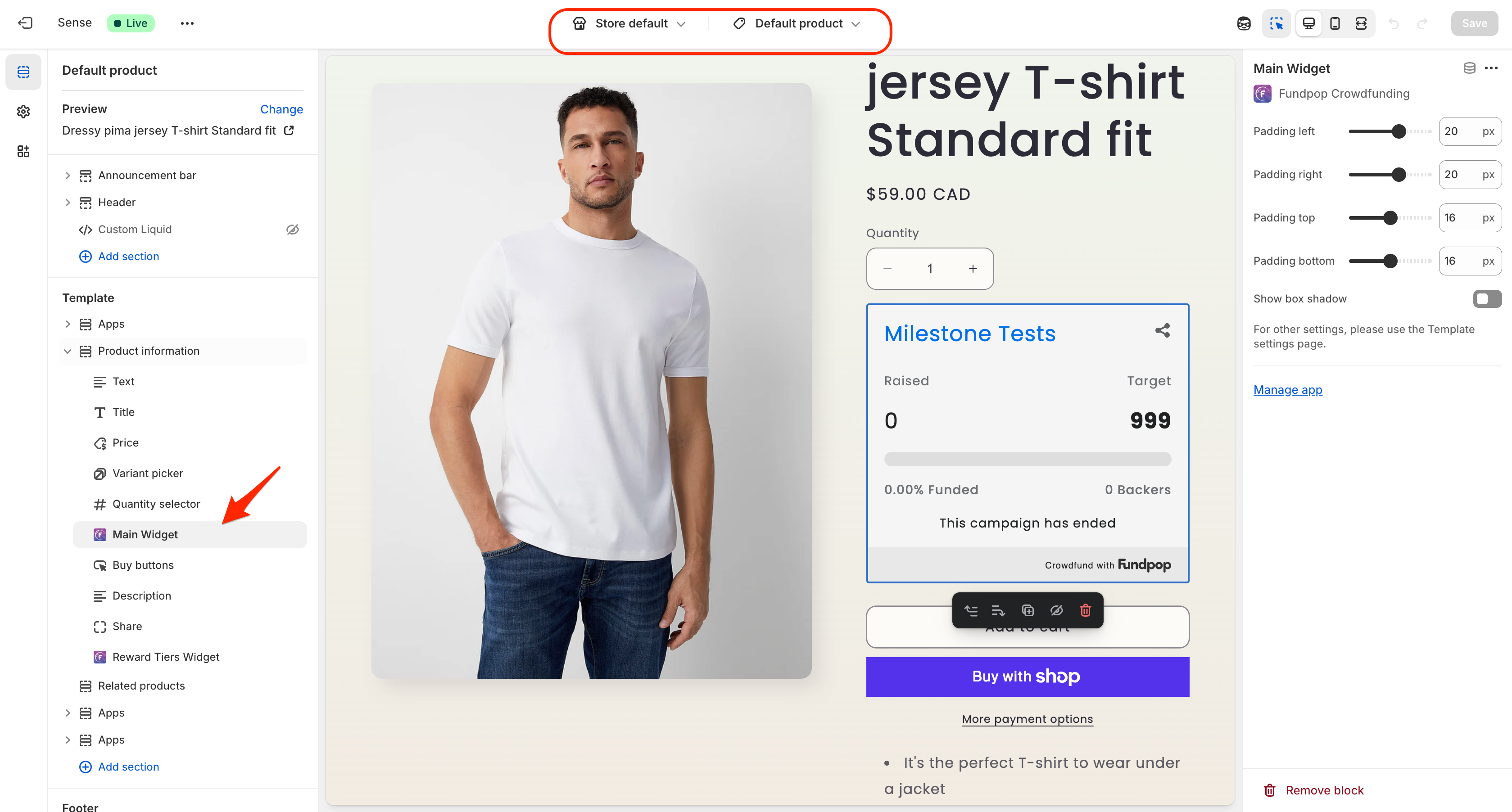 3. In the editor, drag and drop the Fundpop block to your preferred position on the product page