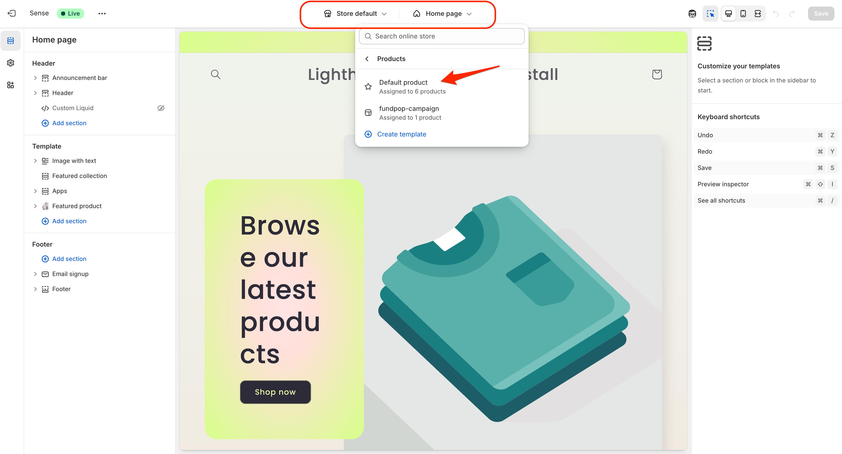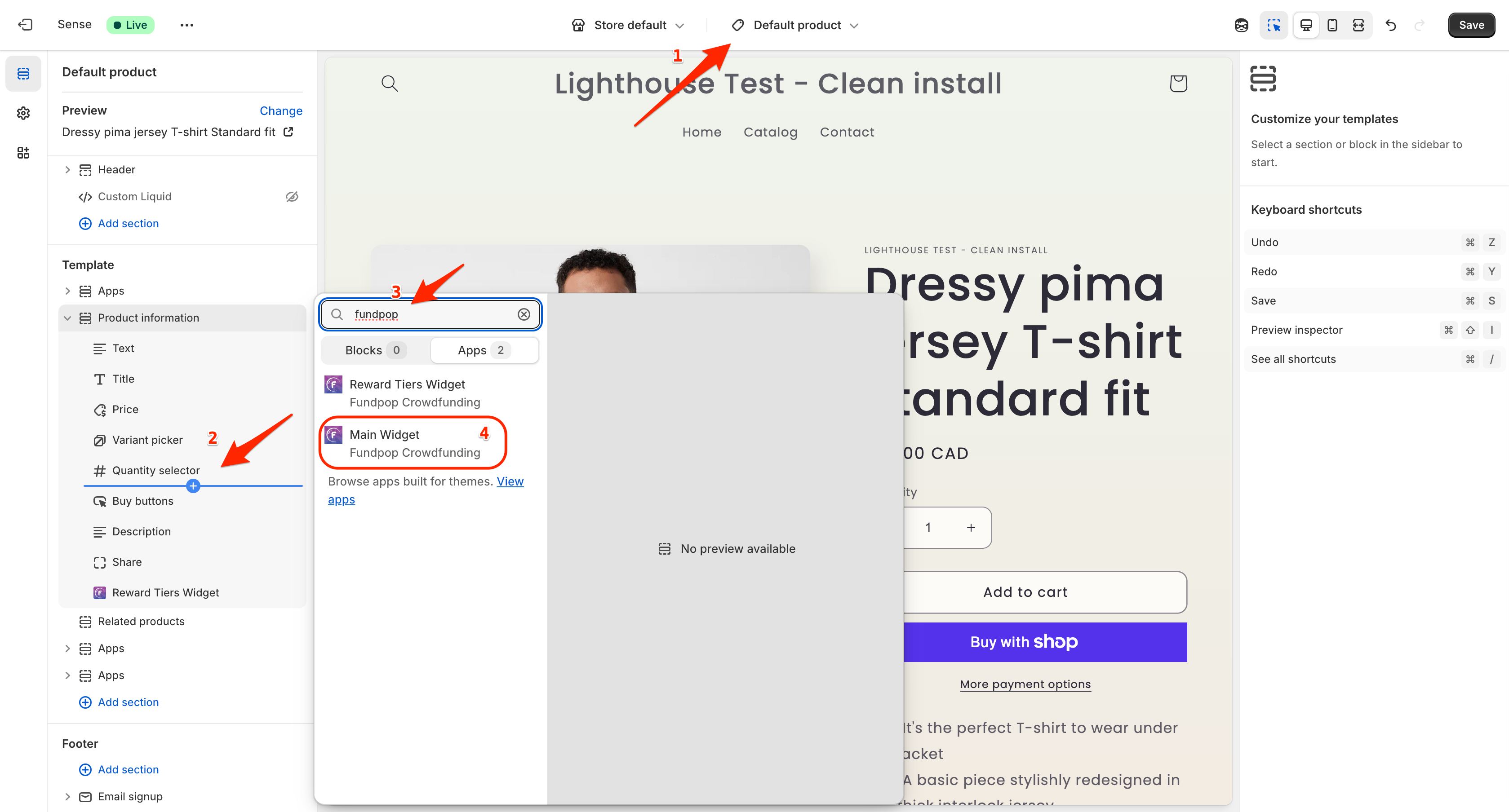 <figure><img src="https://4249416863-files.gitbook.io/~/files/v0/b/gitbook-x-prod.appspot.com/o/spaces%2FFLsec7bx1uBc82FnldVX%2Fuploads%2Fgit-blob-1e9259df6b52719e3b80ec11eac67e32f24c10fe%2FFP-Onboarding-2.png?alt=media" alt=""><figcaption><p>Select the Default product template, then drag the Fundpop block where you want it</p></figcaption></figure>